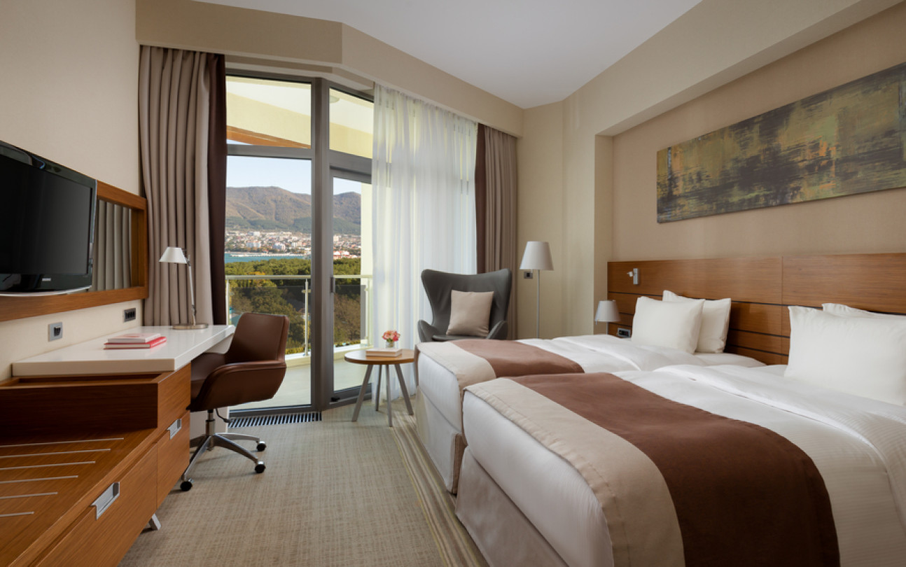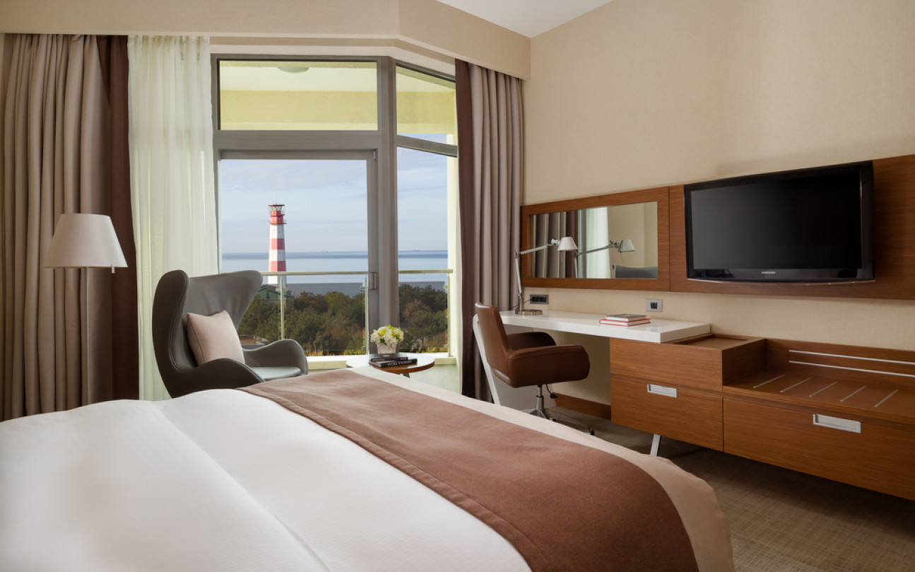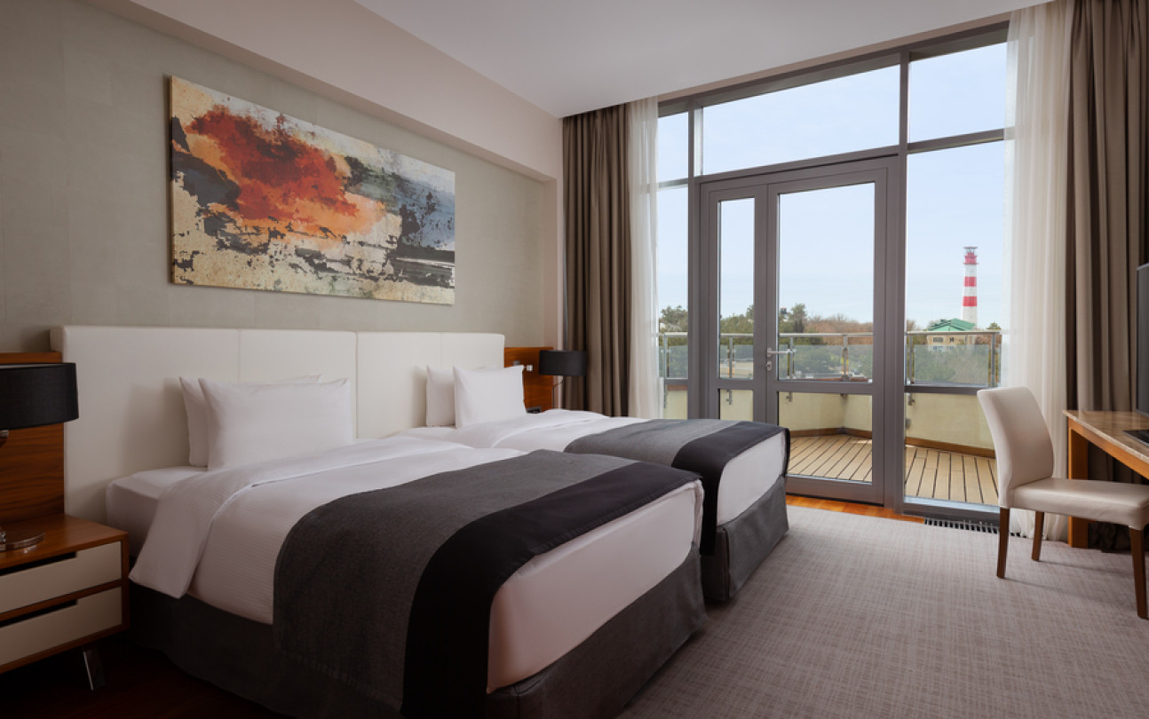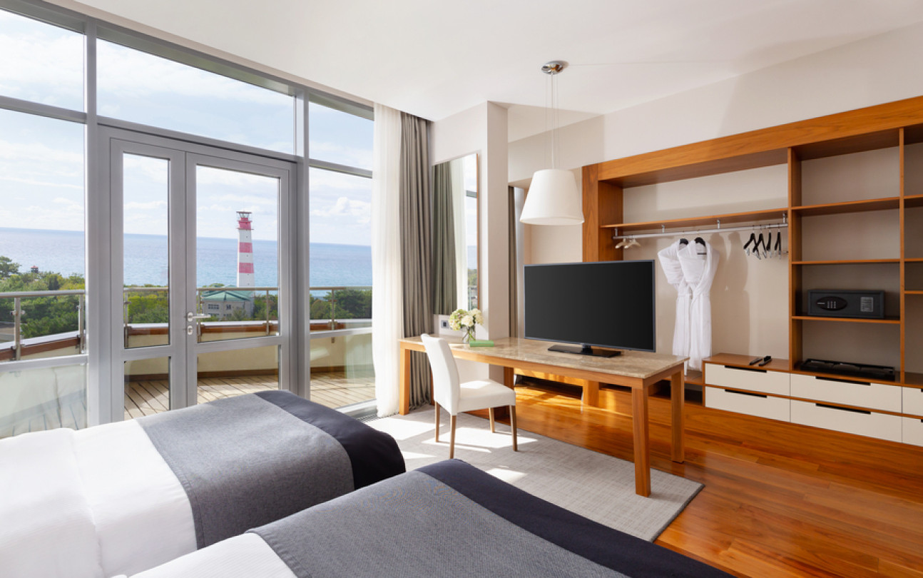 Отдыхали в этом отеле семьей в конце июля. Сам отель оставил положительные впечатления, очень чисто, приветливый персонал, хорошие номера, очень зеленая ухоженная территория и вкусные, разнообразные завтраки! Хорошее расположение вдали от шума, красивая набережная. Понравился сам город, он какой то современный, уютный, вся набережная в соснах! Но по поводу пляжа все неоднозначно : пляж общий, он как бы отгорожен лентами отеля и есть охрана, но это только для вида, все просто заходят и лежат на берегу, соответственно в море куча людей! Хорошо , что он находится на краю набережной, где море чистое.Есть шезлонги, полотенца, водичка, сделали удобный вход в море, кафе от отеля, но нет ощущения 5 звездочного отдыха, куча людей в море и на берегу, как на обычном общественном пляже. Для чего там стоит охрана не понятно.