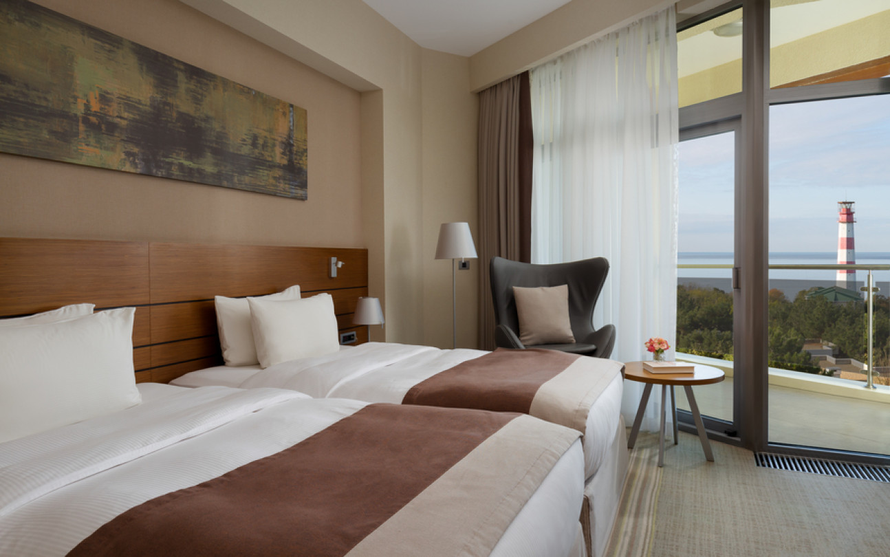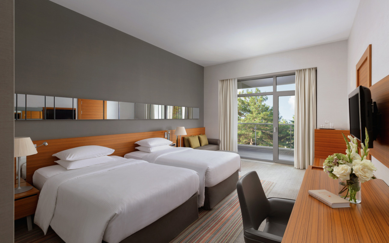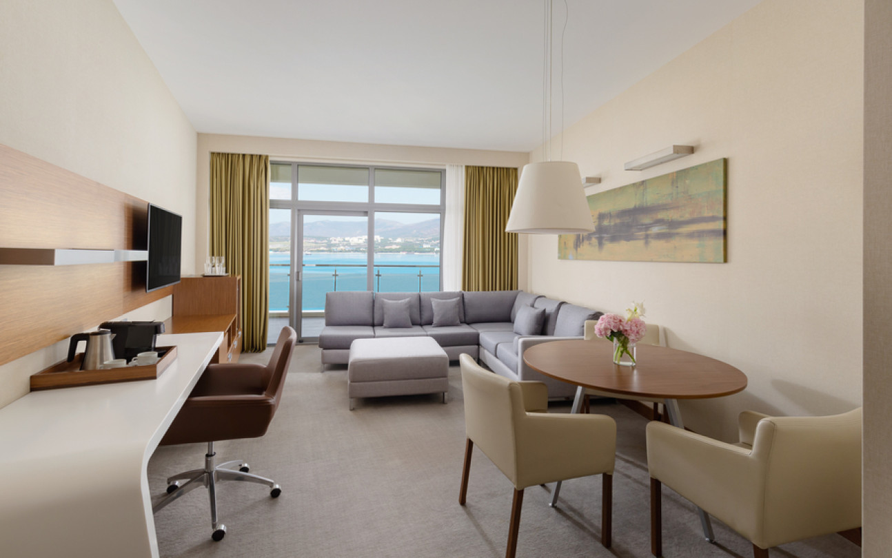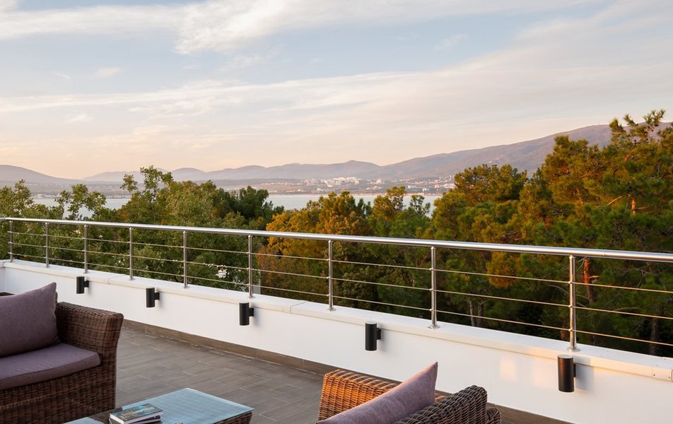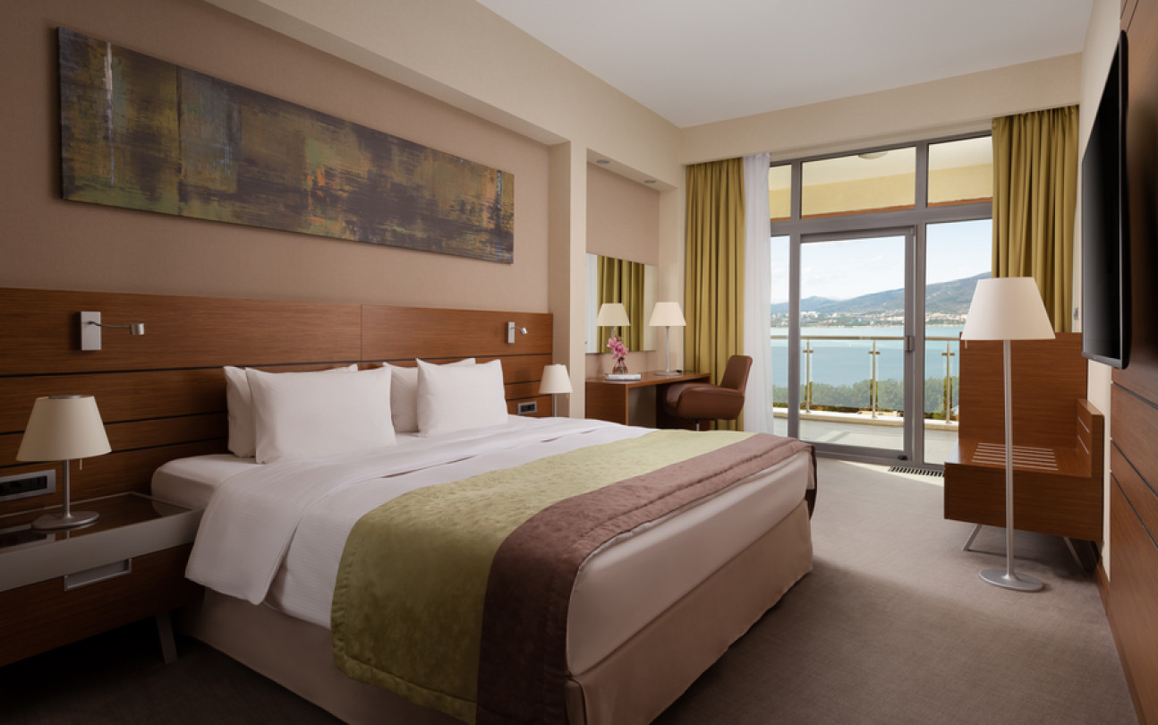 Отдыхали в этом отеле семьей в конце июля. Сам отель оставил положительные впечатления, очень чисто, приветливый персонал, хорошие номера, очень зеленая ухоженная территория и вкусные, разнообразные завтраки! Хорошее расположение вдали от шума, красивая набережная. Понравился сам город, он какой то современный, уютный, вся набережная в соснах! Но по поводу пляжа все неоднозначно : пляж общий, он как бы отгорожен лентами отеля и есть охрана, но это только для вида, все просто заходят и лежат на берегу, соответственно в море куча людей! Хорошо , что он находится на краю набережной, где море чистое.Есть шезлонги, полотенца, водичка, сделали удобный вход в море, кафе от отеля, но нет ощущения 5 звездочного отдыха, куча людей в море и на берегу, как на обычном общественном пляже. Для чего там стоит охрана не понятно.